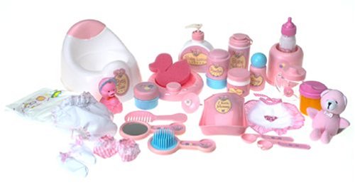 Everything you need to take care of your little one. From bathtime to dinnertime baby will always have what she needs. Feed baby with spoon, fork and plate. Change baby's diapers. Entertain baby with rattle and toys. Don't forget to wash up after playtime using your sponge, powder and lotion. Comes with cute little carrying case so baby will be taken care of wherever she goes. Accessory colors may vary. Ages 2+